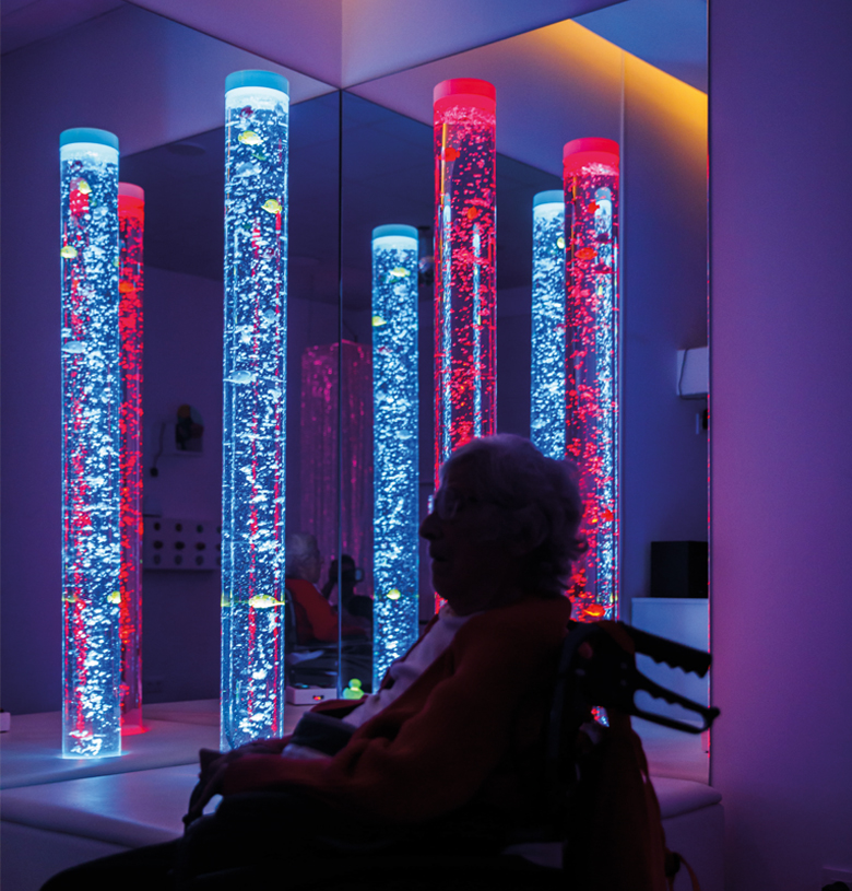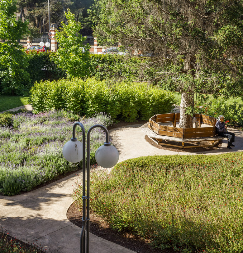 Entre las dotaciones de la residencia destacamos las múltiples salas de estar, las salas de terapias ocupacionales, la Sala de Estimulación Sensorial, los diferentes comedores para los residentes, la galería de juegos y las salas de lectura, televisión y de visita, además de nuestro Jardín de las emociones, un gran espacio exterior que incluye también nuestro huerto, pajarera y pérgola.